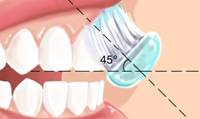 | Pour le brossage des faces externes et internes des dents, la brosse doit être inclinée à 45° sur la jonction entre la gencive et la dent. Un mouvement de 'rouleau' sera réalisé 2 à 3 fois par dent pour éjecter la plaque dentaire. |